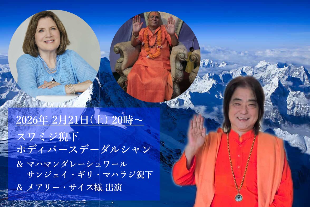 スワミジ猊下は昨年12月25日にマハ・マンダレーシュワール(偉大なる宇宙の大神)に就任されて以降、ますます世界的に注目を集めておられます。また、サンカルパヨガ・ファンデーションの瞑想リトリートで達成された偉業の数々も広く知られ、世界中の聖者の方々の称賛を頂いております。当日は、リトリート参加者の体験談のシェアも予定しておりますので、覚者のもとでの瞑想体験に関心をお持ちの方にも、ご参加をお勧めいたします。近年、猊下は海外でのご活動が多く、オンラインダルシャンの開催は毎月行うことが難しくなっております。本物の覚者である猊下のお話を聞き、恩寵をいただくことができる大変貴重な機会となります。皆さまのご参加を心よりお待ちしております。